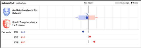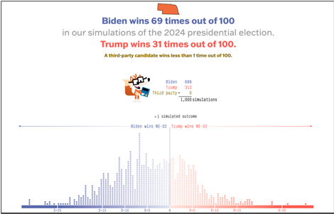 This race will likely finish within five points, and I concur with 538 and The Economist, here at the end of June 2024, that this race favors Biden, but isn’t a layup. I think Trump has about a 1 in 3 chance to carry it, and this forecast may tighten in the next four months. The danger of Biden carrying NE-2 comes if Trump carries Nevada, Arizona, and Georgia, but isn’t permitted to carry Wisconsin, Pennsylvania, Michigan, New Hampshire, and Minnesota. He would be stuck at 268 electoral votes, and this single vote from NE-2 would prevent 269-269 tie to Trump’s disadvantage.