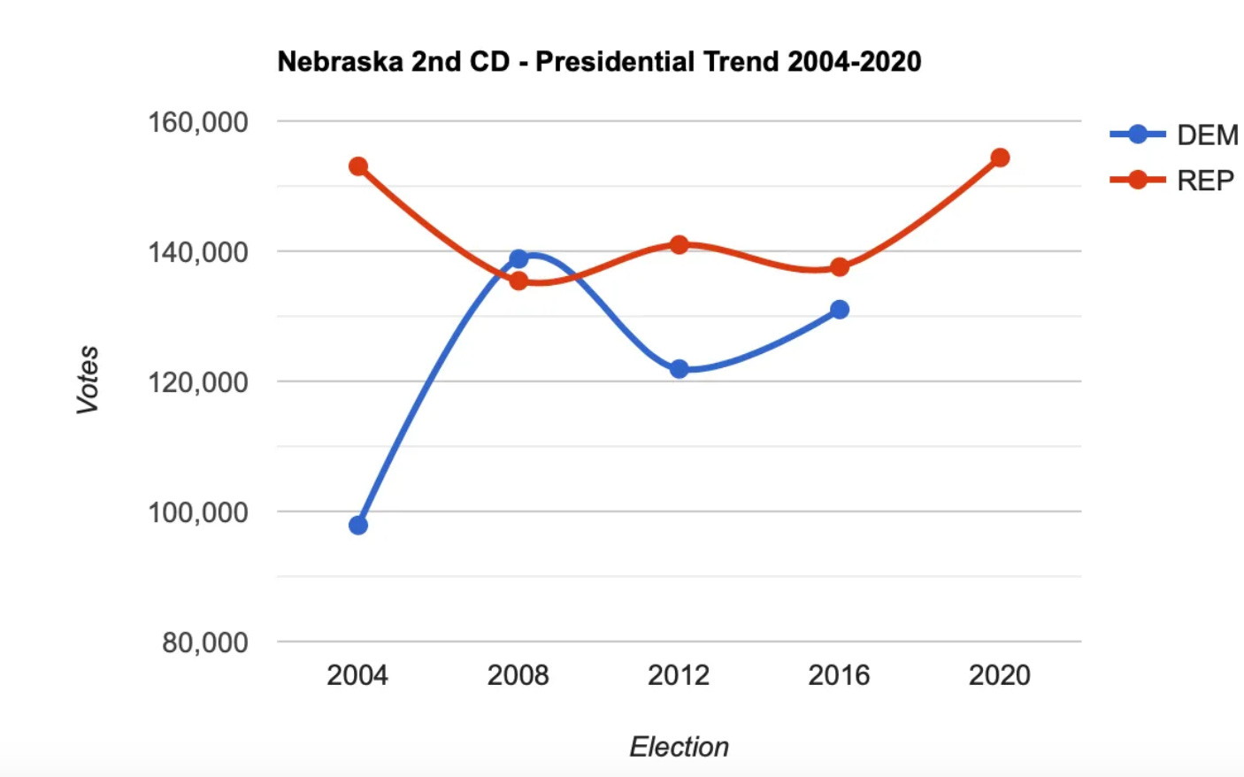 Note: Romney’s race in NE-2 include a different allotment of precincts in Sarpy County. The above graphic reconstructs the precincts as found in 2016 and 2020.