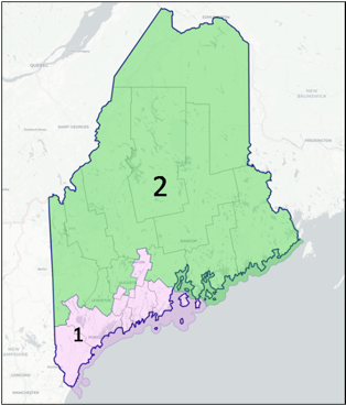 · Democrat strength is clustered in the far southern end of the state, with Cumberland (23.7%) and York Counties (15.8%) combining for nearly 40% of the statewide ballot count in the 2020 presidential race. The northern part of the state, which falls into ME-2, is much more favorable for Republicans with a working-class agenda but splits its votes (Democrat congressman) and cannot regularly overtake the massive Democrat margin of Cumberland County (metro Portland), which dwarfs the next largest margin for either party by nearly 10%.