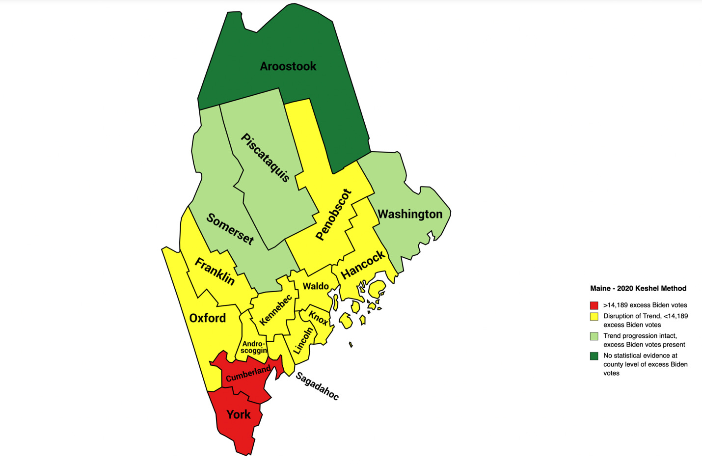 Trump’s 2016 margin in ME-2 was 36,360. Despite a solid gain and coalition and registration shifts in his favor, Trump’s 2020 margin dropped to 27,996, whereas Biden inflated his margin from 58,390 to 102,331 in ME-1. If you ask me, I will have to guess the bloating in York and Cumberland Counties is the byproduct of ballot harvesting rings operating just down the Interstate in Boston, which also have duties in Rockingham and Hillsborough Counties, New Hampshire.