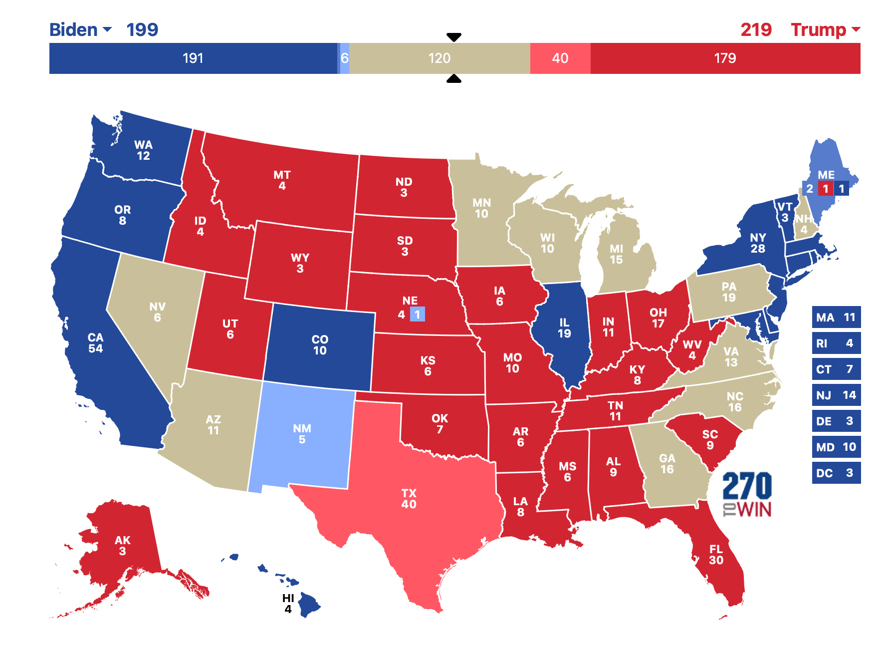 President Trump will win ME-2’s single electoral vote, most likely by at least 10%. Joe Biden will easily carry ME-1’s single electoral vote. You can read the individual summaries for both of those races here. The map showing the split between the districts is below: