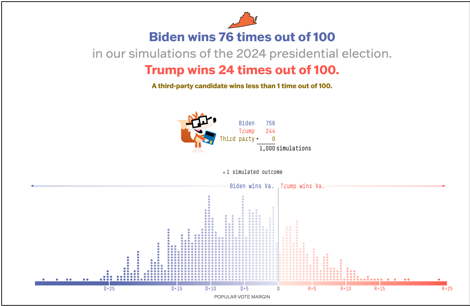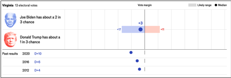 · 538 expects Biden to carry Virginia with 76% likelihood as of the time of this writing, and by an average of 5.8%.