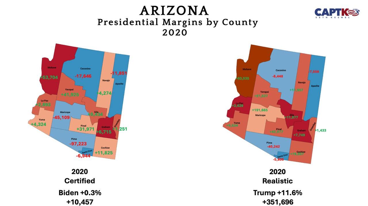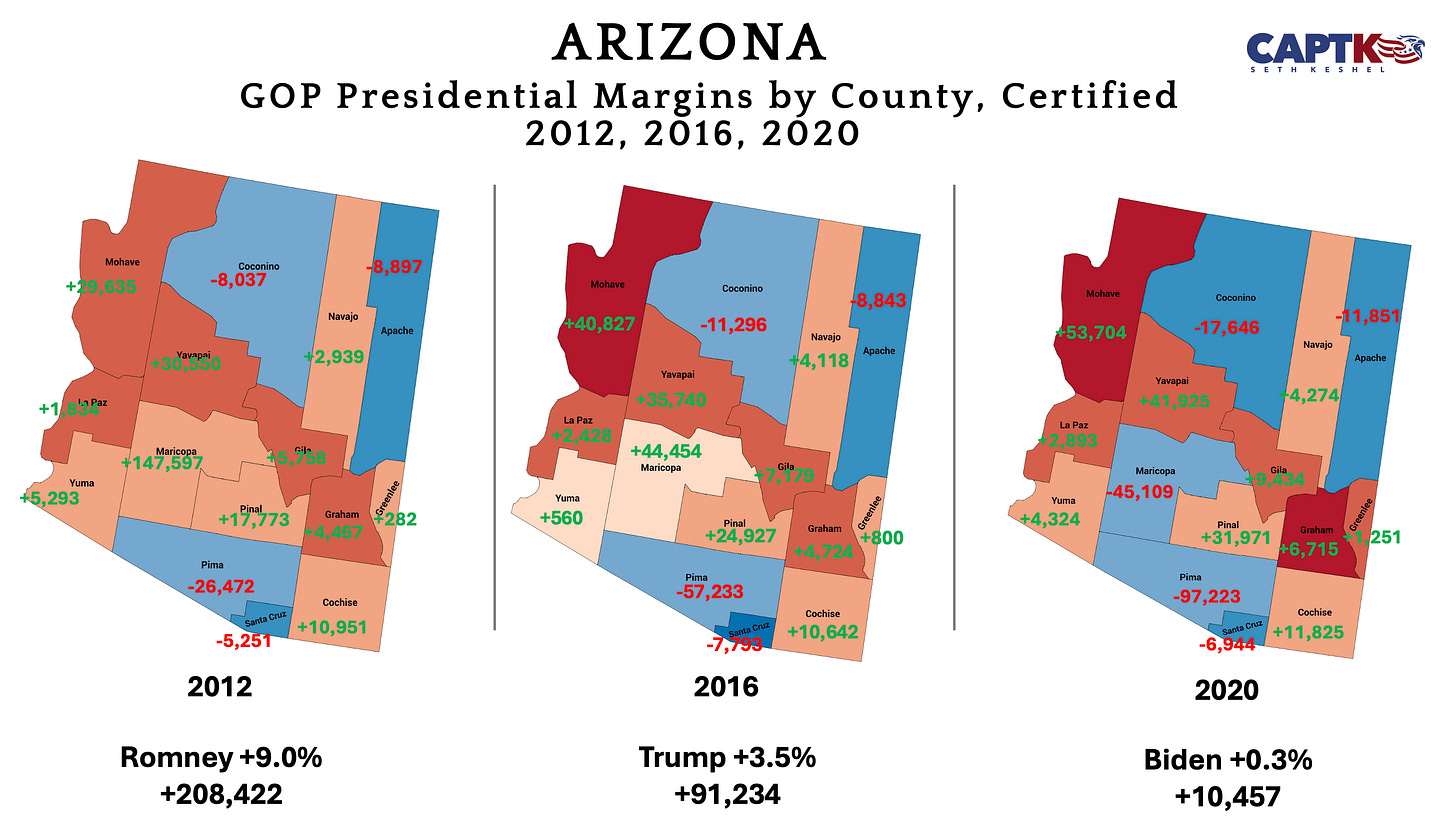 · Republican strength has traditionally been suburban and centered on Maricopa County, while former Democrat counties, such as Pinal, are now trending heavily Republican. Donald Trump’s gains in both Maricopa County and statewide were all time Republican single cycle growth records, making his dubious loss even more unbelievable.
