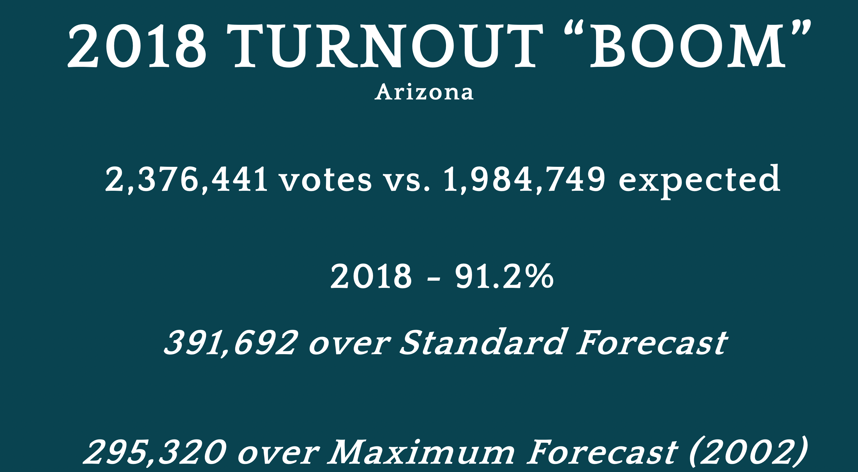 I moved into the 2018 midterms, which I believe were the first highly manipulated elections in our country, not the 2020 election. You can watch the linked video above to see me showing the scratch notes of how I arrived at my estimates, but the 2018 Arizona midterm had 391,692 more votes cast than a “ballpark” forecast would call for, and 295,320 more than an election matching the highest turnout coefficient since 1994 would have. The 2018 Arizona midterm was the election that pushed Kyrsten Sinema into the U.S. Senate, and more importantly, Katie Hobbs into the Secretary of State’s office, even after Republican Steve Gaynor had been called as the winner on election night. Now look who is in the Governor’s mansion.