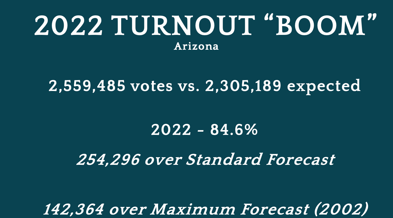 Finally, I discussed the 2022 midterms, still fresh in the minds of all attending the event, and the subject of a continuous series of court challenges now making its way to the Arizona Supreme Court. 2022 has been 142,364 and 254,296 more votes than can reasonably be predicted after arriving at the previously stated, 2020 election likely totals. That range overcomes the margins of all four key top of the ticket races supposedly won by Democrats – Governor, Secretary of State, Attorney General, and U.S. Senate. Blake Masters, candidate for U.S. Senate against Mark Kelly, did everyone a disservice by conceding that race and made Kari Lake, Mark Finchem, and Abraham Hamadeh look like sore losers to some.