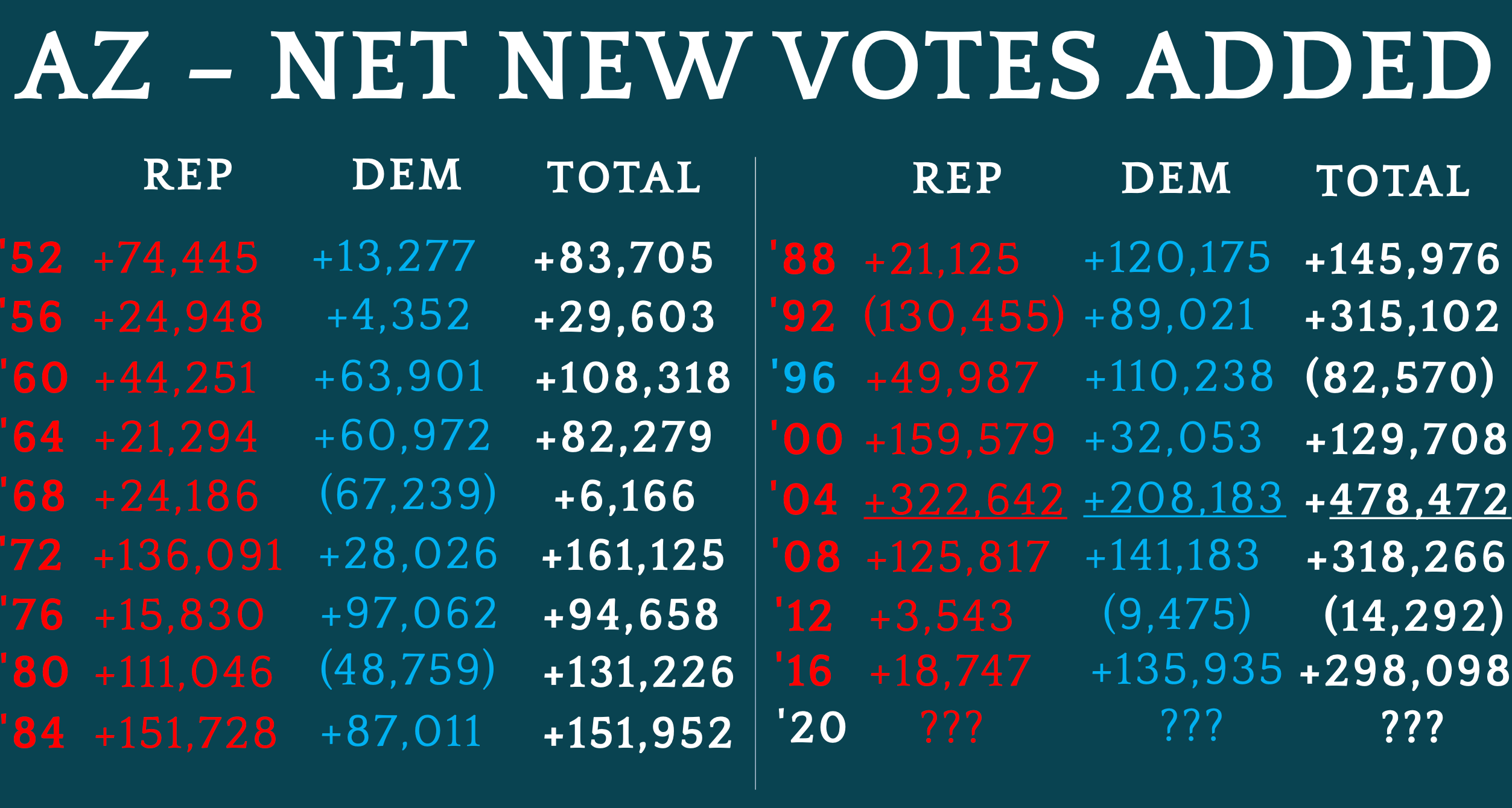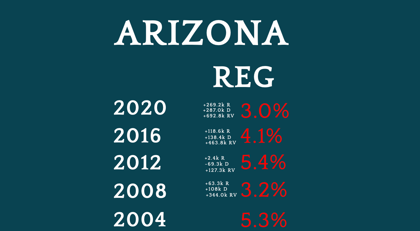 As depicted above, the Republican streak of dominance since 1952 is impressive. Only Bob Dole lost Arizona presidentially for the GOP since 1952, and it is clear that Clinton’s incumbent advantage and Ross Perot’s performance in the state brought about Dole’s loss (Perot had nearly cost Bush 41 the state in 1992). The GOP nominees between 2008-16 parked within a 22,000 vote window of the same exact vote total, yet still, the party held the state. Donald Trump’s net gain in 2020, 409,285 votes, is a Republican record. Based on the trend line – do you see a pathway for Joe Biden to win a state that supposedly is slowing in population growth?