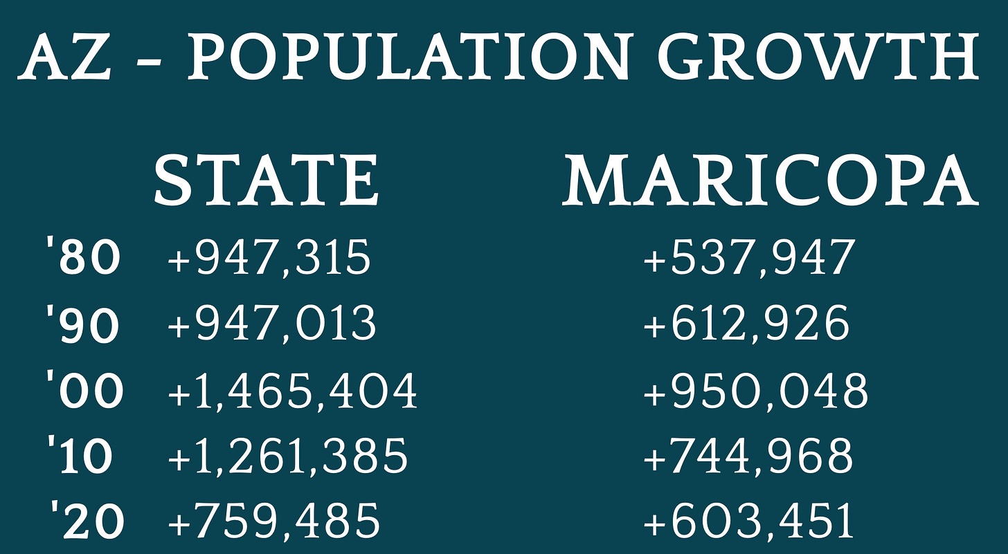 As the graphic above depicts, Arizona’s population grew by just 759,485 (officially) according to the 2020 census, since the previous census in 2010. That marks the lowest growth in the state since the 1960s; Maricopa County’s numbers echo those, with the mega-county having grown by the lowest amount of net new residents since the 1970s. These numbers fly in the face of the proclamations echoed by all sides of the political spectrum – “Wow, we are exploding in population!”