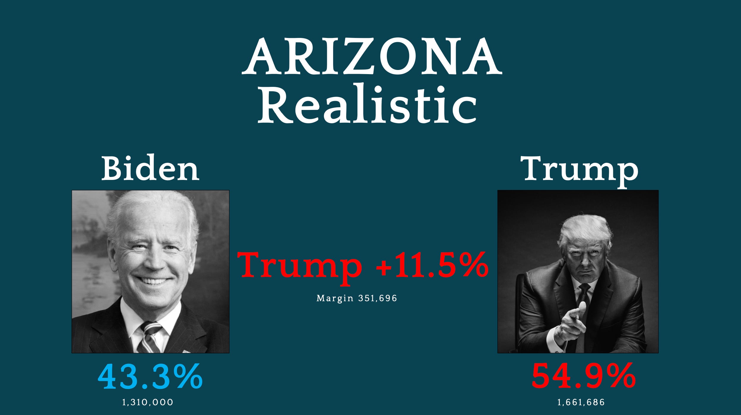 Allowing for Democrat record gains in Maricopa and Pima Counties, and all counties that show a pattern of Democrat gains, Biden loses the state by a minimum of 11.5% in any real election. Senator Ken Bennett was not pleased about this statement and peppered me with questions about the trend in the state, which was favorable to Democrats in 2016 after Trump’s vote total was nearly identical to Romney’s and McCain’s. I explained, in a matter of fact way, that the trend calculation derives from the raw vote totals, and given that Trump’s gains are Republican records in a Republican stronghold, it is obvious the state would not have a “leftward” trend in 2020.