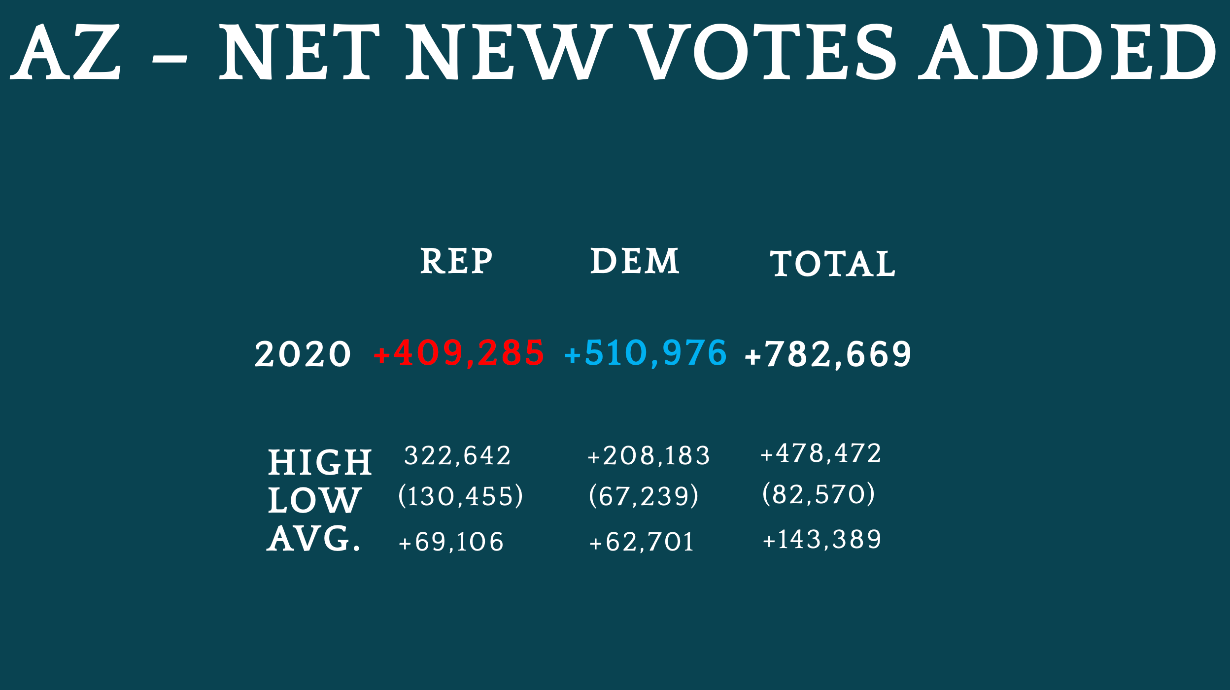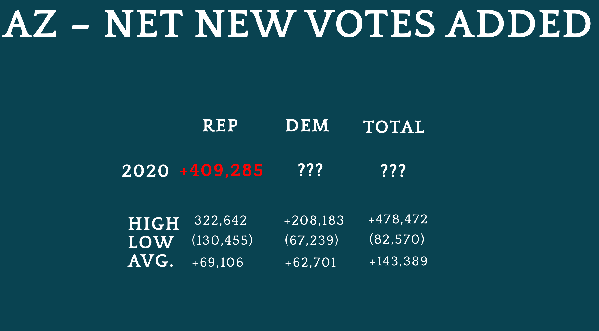 Biden’s “gain” doubles Kerry’s, plus another 94,000, which barely squeaks past Trump’s record Republican stockpile of votes. Also, the total number of net new votes, again, in a state that is supposedly slowing in its rate of population growth, is 304,197 higher than the previous total net new vote boom set in 2004, when the rate of population growth was still zooming according to official documentation.