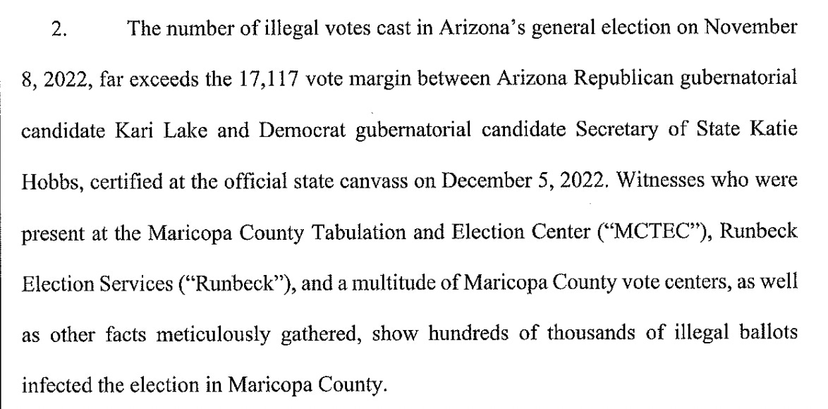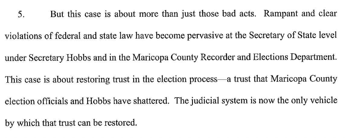 Above, on page 3, Lake’s case correctly declares the American election crisis is a crisis of transparency, which counts the judiciary as its only hope for remediation. Hobbs is properly described as a corrupt bureaucrat guilty of colluding with Maricopa County’s own corrupt bureaucrats to destroy the vote in Arizona.