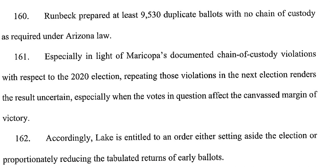 This is a big hit to the Lake team, and one that Thompson should have ruled in their favor on. The 2020 Maricopa County audit showed serious problems with signature verfication and the impossible timeframes in which signatures were supposedly verified on an enormous quantity of mail-in ballots. Lake is barred from this count because of technicality, that since signature verification is an election procedure, which takes placeduring an election, it cannot be addressed after the election. In other words, “we know this is a disaster, but the rules say we can’t touch it after the election is over.” The blame lies with Attorney General Mark Brnovich and the corrupt Arizona legislature for not rectifying this problem after it came to light following the 2020 “election.”
