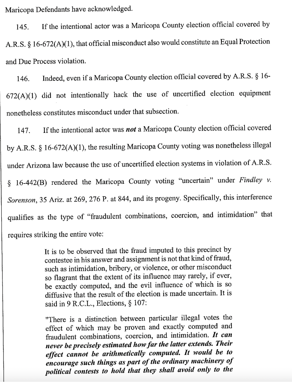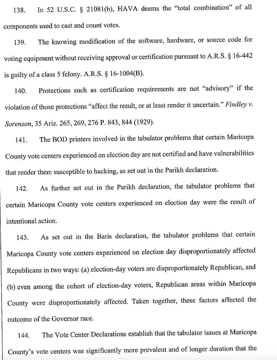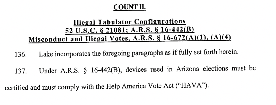 Count II, above, pertains to the election day debacle related to machine malfunctions and tabulator errors. The challenge will be to prove that said debacle was deliberately incurred and given that Maricopa County apparently maintained a Republican voter “heat map” and its magistrates have openly opposed Kari Lake, Donald Trump, and the America First agenda, this may be possible.