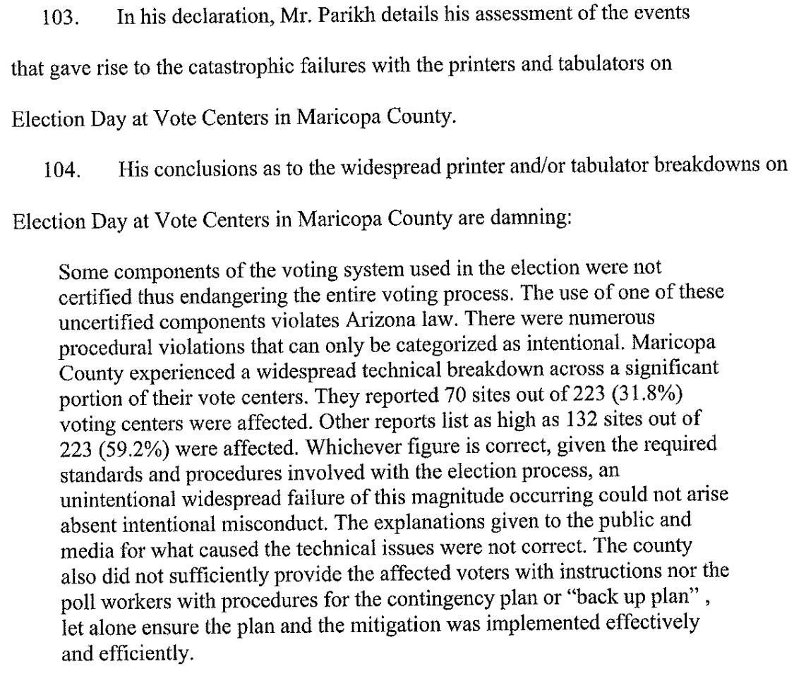 As I wrote in my article outlining Kari Lake’s lawsuit last week, polling expert Richard Baris also has sworn testimony attesting to the impact of Republican disenfranchisement on the final tallies. It appears that the burden for this count will be on proving misconduct on behalf of Maricopa County election administrators and evidence of a pre-meditated plan to destroy the integrity of the election.
