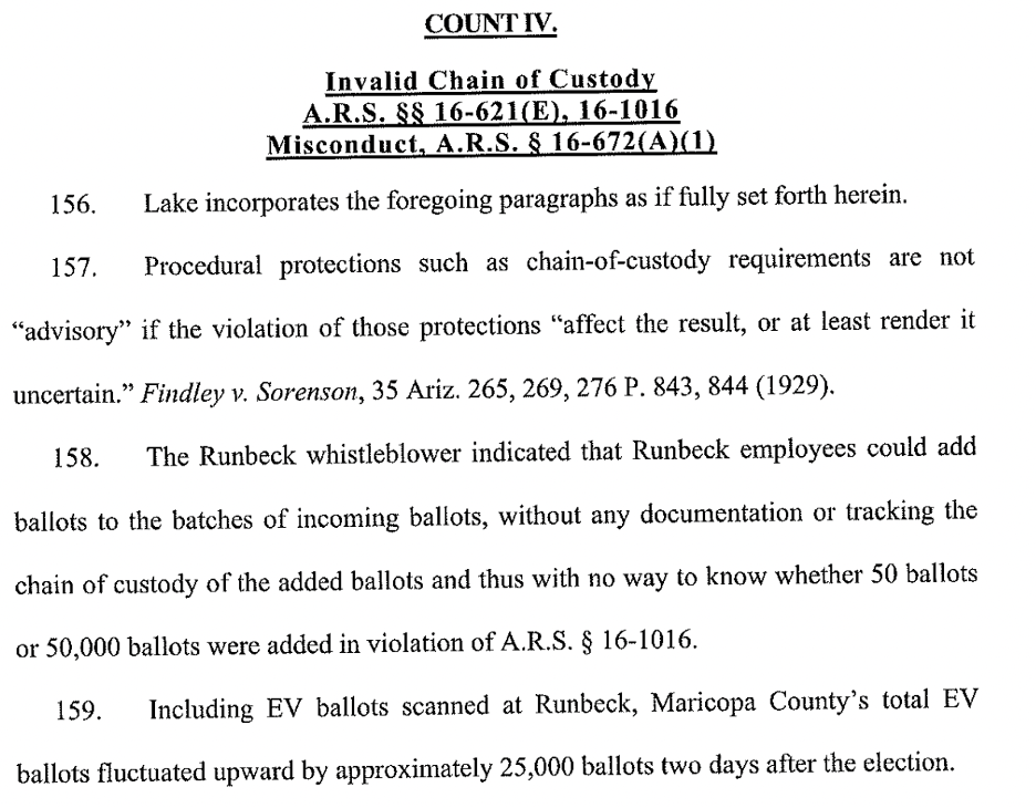 Onlookers have correctly stated in that what amounts to a “high hurdle” of proof for Lake’s team to show, Count IV is the best shot. Recently, a Runbeck whistleblower has alleged as many as 300,000 ballots were added to the count, with no transparency available to determine fact from fiction, and plenty of fluctuation present in election reporting.