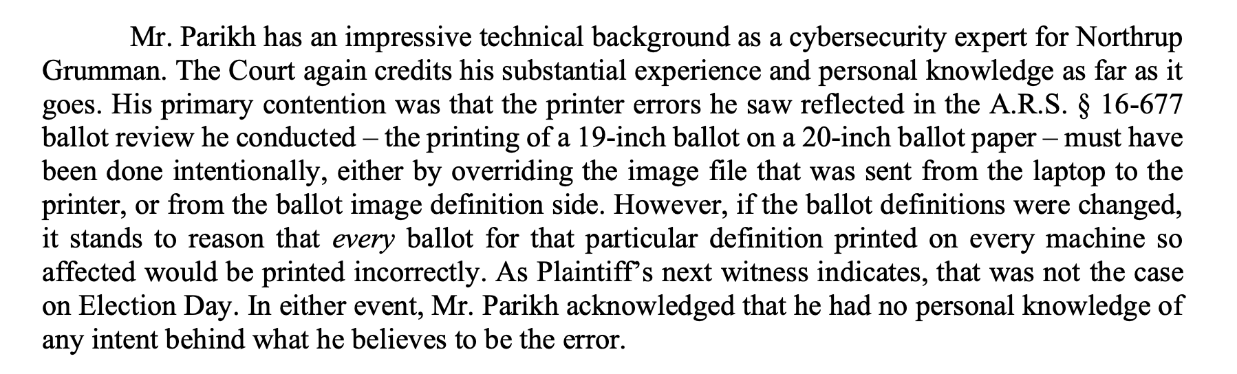 Parikh testified by expanding on Dan Sundin’s big catch from last month, that tabulators failed to read 19” ballots printed on 20” paper, causing misreads and for the ballots to be sent to “Door 3” for duplication or adjudication. The judge hails the Door 3 option, once again, as if voters have great reason to trust Maricopa County after their abject failure to run elections with any degree of competency, as proven in the 2021 Maricopa County audit. The judge tosses Parikh’s testimony for the same reasons he threw out the other two – because the defense didn’t corroborate the testimony. I do not recall 19” ballots being an issue during the lengthy early voting period.