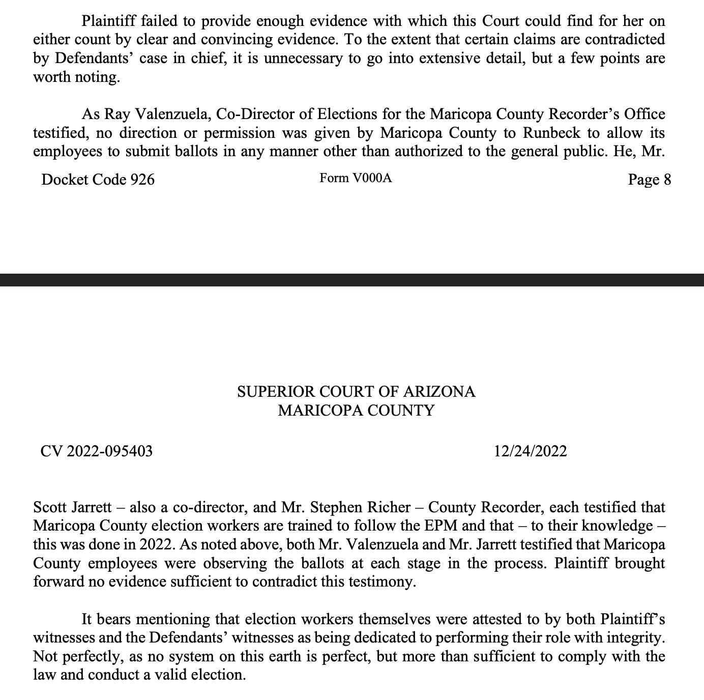 Meanwhile, Judge Thompson had no problems whatsoever taking Maricopa County’s words at face value based on the previously mentioned guideline that government workers in their official capacity are to be given benefit of the doubt. Both Valenzuela’s and Jarrett’s testimonies are mentioned here to negate what was brought by Lake’s witnesses. Stephen Richer is mentioned here, in that he said county employees were trained to follow the procedures manual.