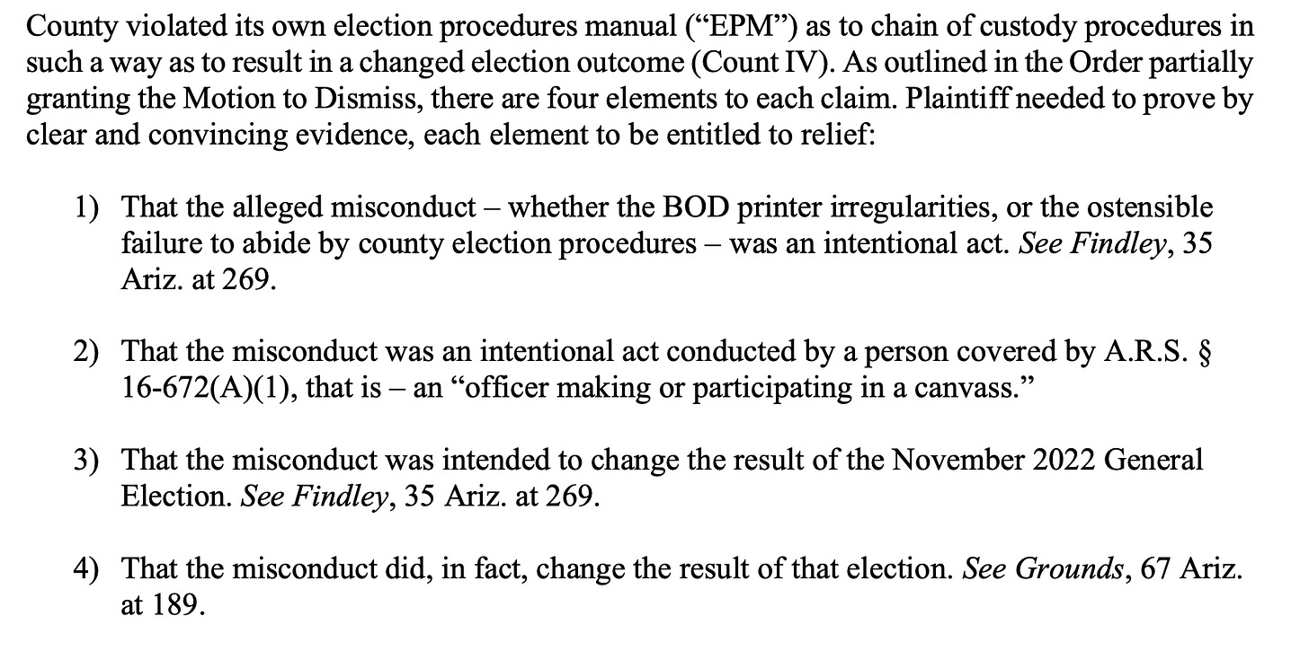 It is particularly interesting to me that Judge Thompson fails to detail the relief on Page 3. The relief does indeed request that the election be set aside, but another option other than Lake being named the winner was fronted, and that was to require Maricopa County to re-do their election. With so much doubt present in the minds of voters, and with so much evidence all but guaranteeing there was pre-meditated election manipulation, why not issue an order for a new election? That would disenfranchise no one, and in fact, would protect the rights of the minority, the so-called “losing” party from the first round of the tainted election.