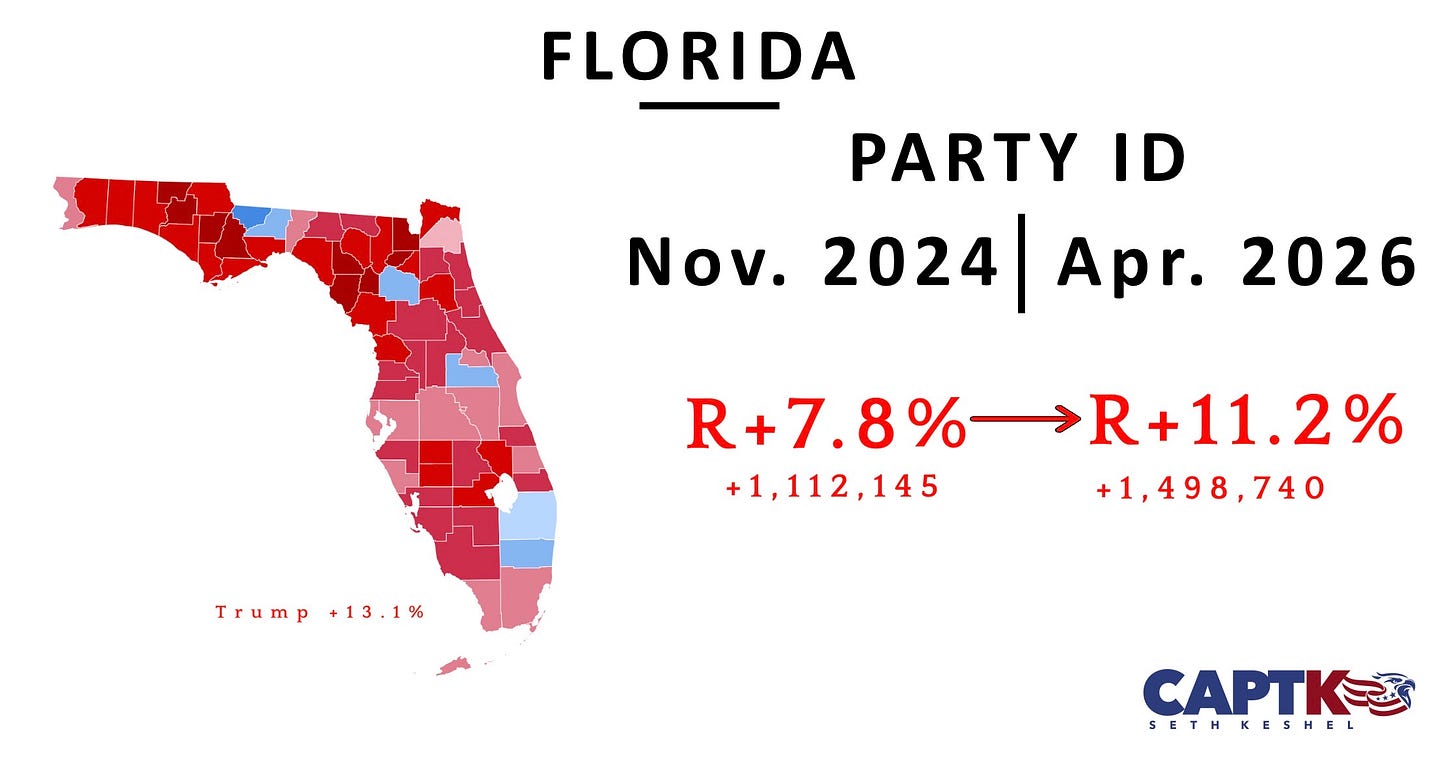 This is the smallest monthly net gain for the GOP since I’ve been tracking this data in these monthly articles (March 2025), but it is primary season and both parties are registering voters. Nevertheless, Republicans continue to put distance between themselves and Democrats, sustaining the Sunshine State’s push to become redder than Texas in the next presidential election.