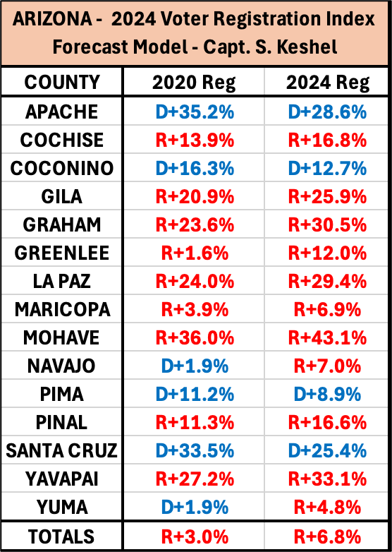 Arizona’s voter registration shift is utterly horrific for Democrats, as all 15 counties have shifted to the right. Maricopa County, which contributes more than 60% of all statewide ballots, has shifted more than 77,000 registrations net toward the GOP in four years, and even Pima County has lost a bit of its edge, with the Democrat advantage there dropping below 9%. Minority-heavy Yuma and Navajo Counties have flipped to a Republican registration advantage. Overall, Republicans have more than doubled their 2020 voter registration advantage after two consecutive presidential cycles with a declining advantage.