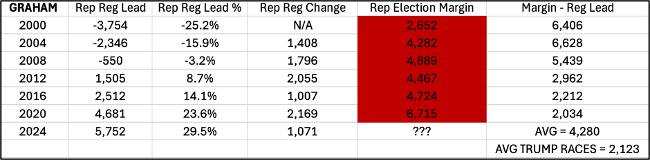 That average comes out to 2,123 to the right of the registration advantage. Right now, the Republicans have a +5,752 registration advantage (R+29.5%) in Graham County, which will likely clear 6,000 by Election Day. Trump’s +2,123 coefficient average plus the registration advantage of +5,752 leads me to conclude Trump’s likely margin in this model is +7,875 (+52.5%) in Graham County, which would up his margin by +1,160 from 2020.