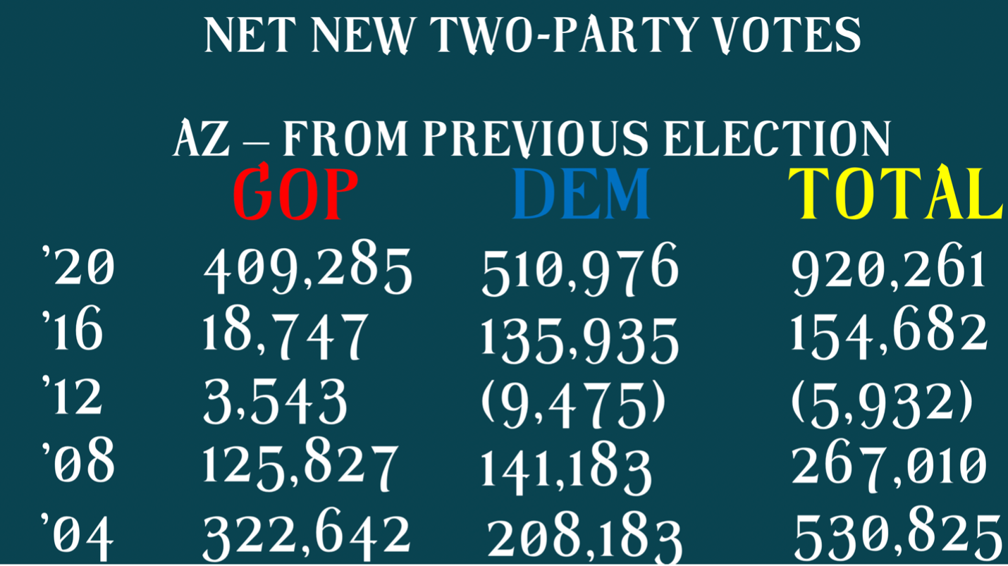 In the case of Arizona, a simple question exists. How does a relatively small state (11 electoral votes) rack up nearly a million net new “two party” (Democrat and Republican) votes from 2016, and not gain a single electoral vote for the coming election decade?