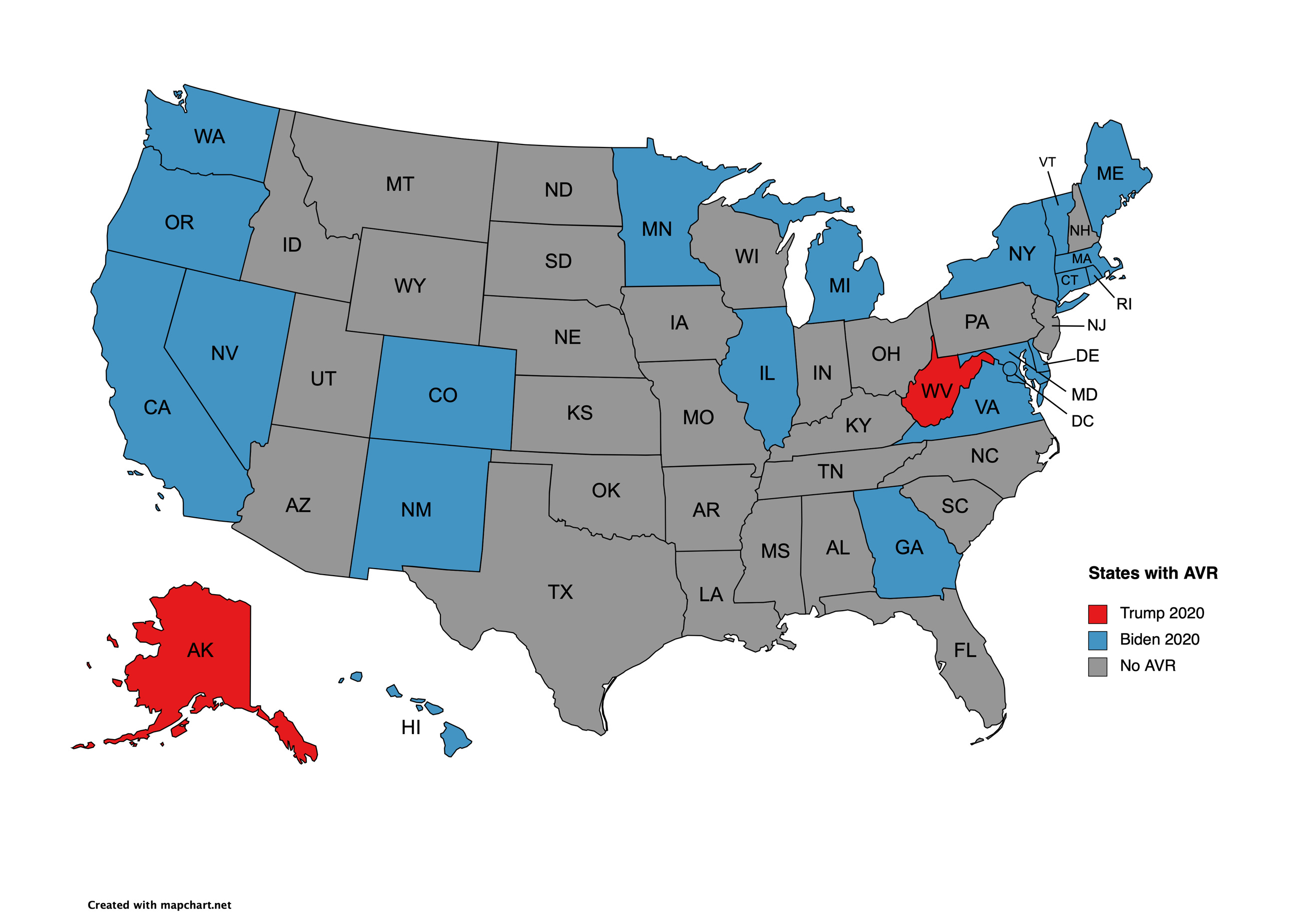 Factoring in Minnesota, Hawaii, and Delaware as not having AVR at the time of the 2020 election, Trump carries the electoral votes of 30 states by a 223-63 margin.