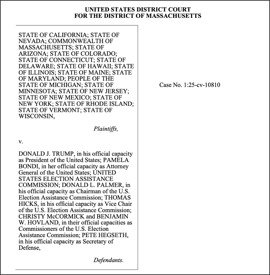 Yesterday, 19 states led by California filed suit against President Trump and several of his subordinate officials and the Election Assistance Commission, conveniently in the U.S. District Court for the District of Massachusetts. This lawsuit, masterfully shopped into Massachusetts court, is the Uniparty left’s response to Trump’s executive order laying the groundwork for major actions on election integrity, which was signed at the end of March.