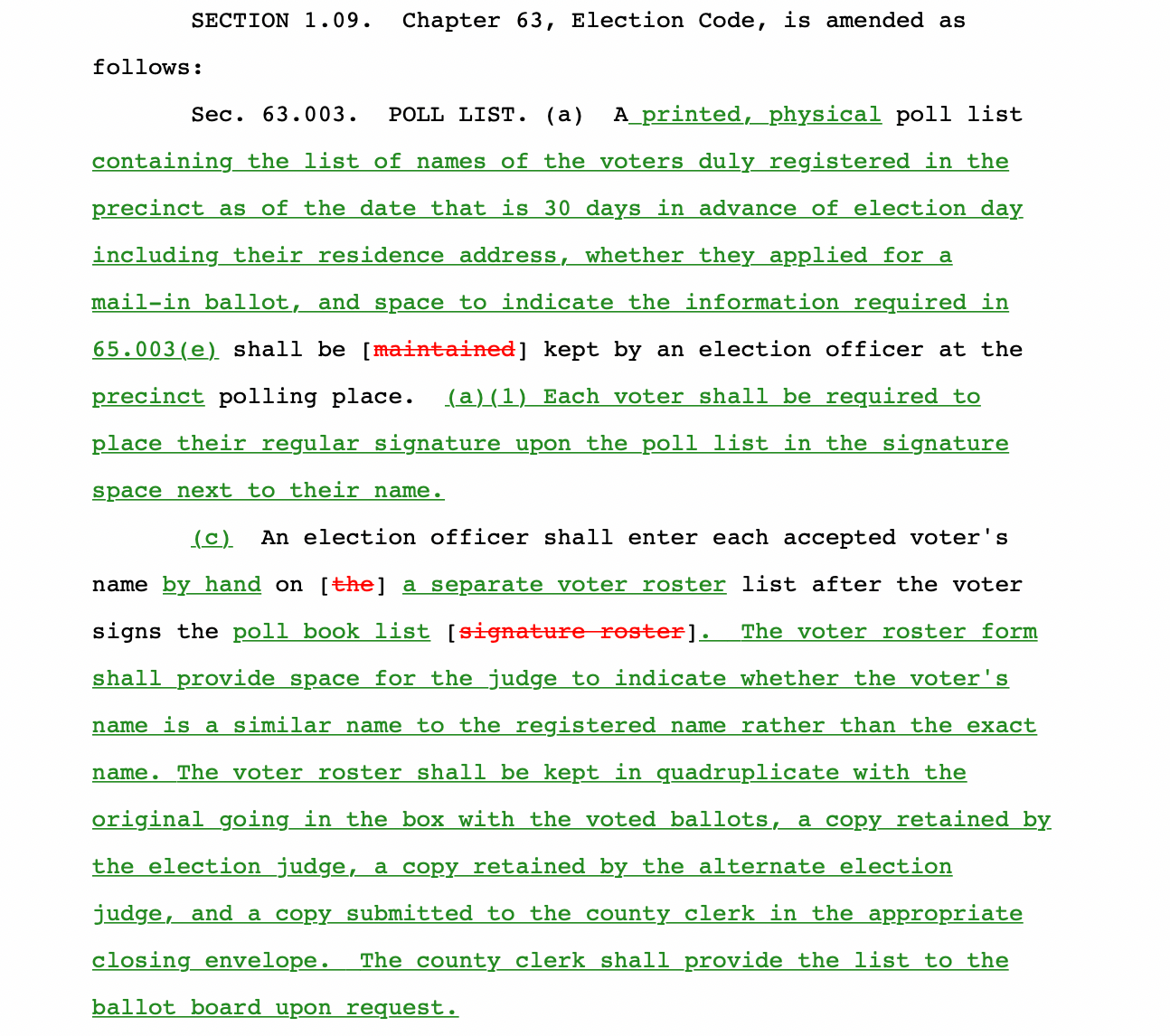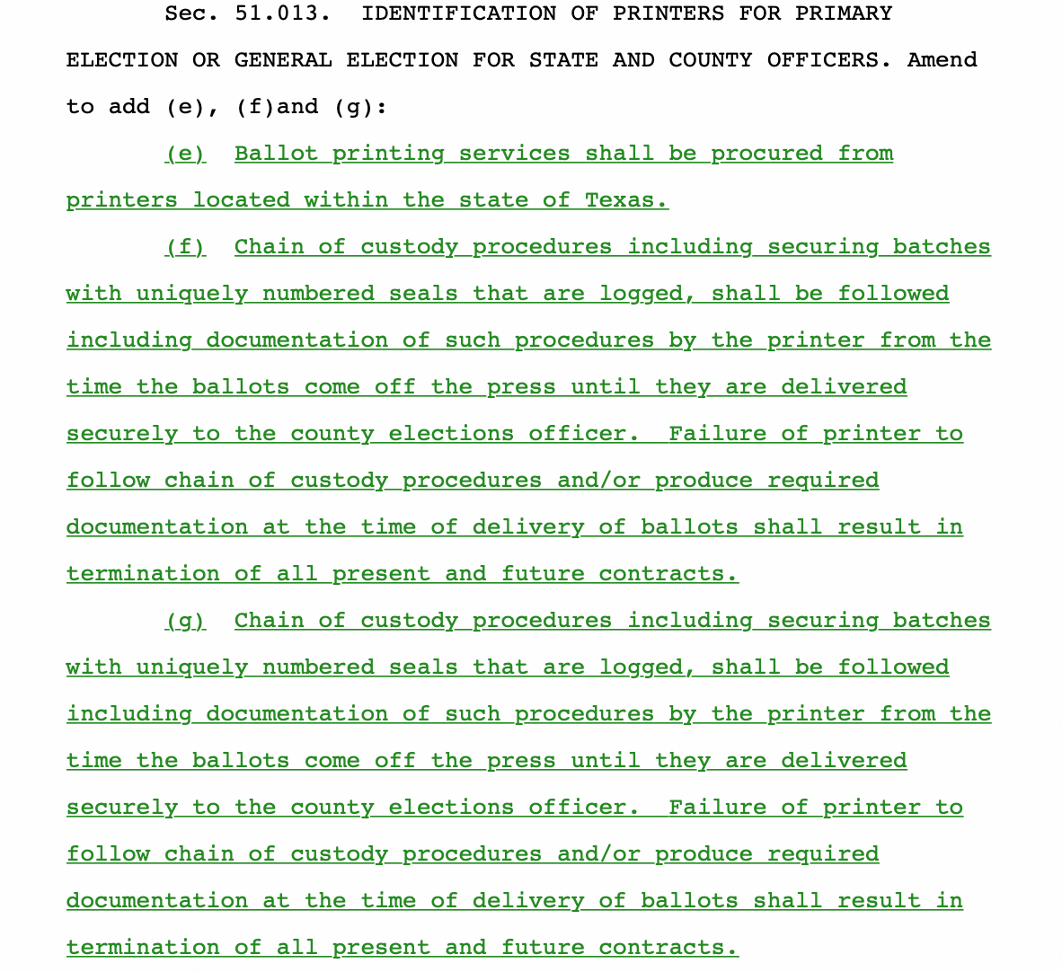 Texas State Representatives Steve Toth and Terry Wilson have sponsored a bill, Texas House Bill 5234, that is currently waiting to be heard by the House Elections Committee. It is otherwise known as the Election Accuracy, Transparency, and Accountability Act. Given that Texas has been a slam-dunk Republican state for the first fifth of this millennium, and has not produced Democrat electors since 1976, many take Texas for granted and may not see the need for significant election reform.