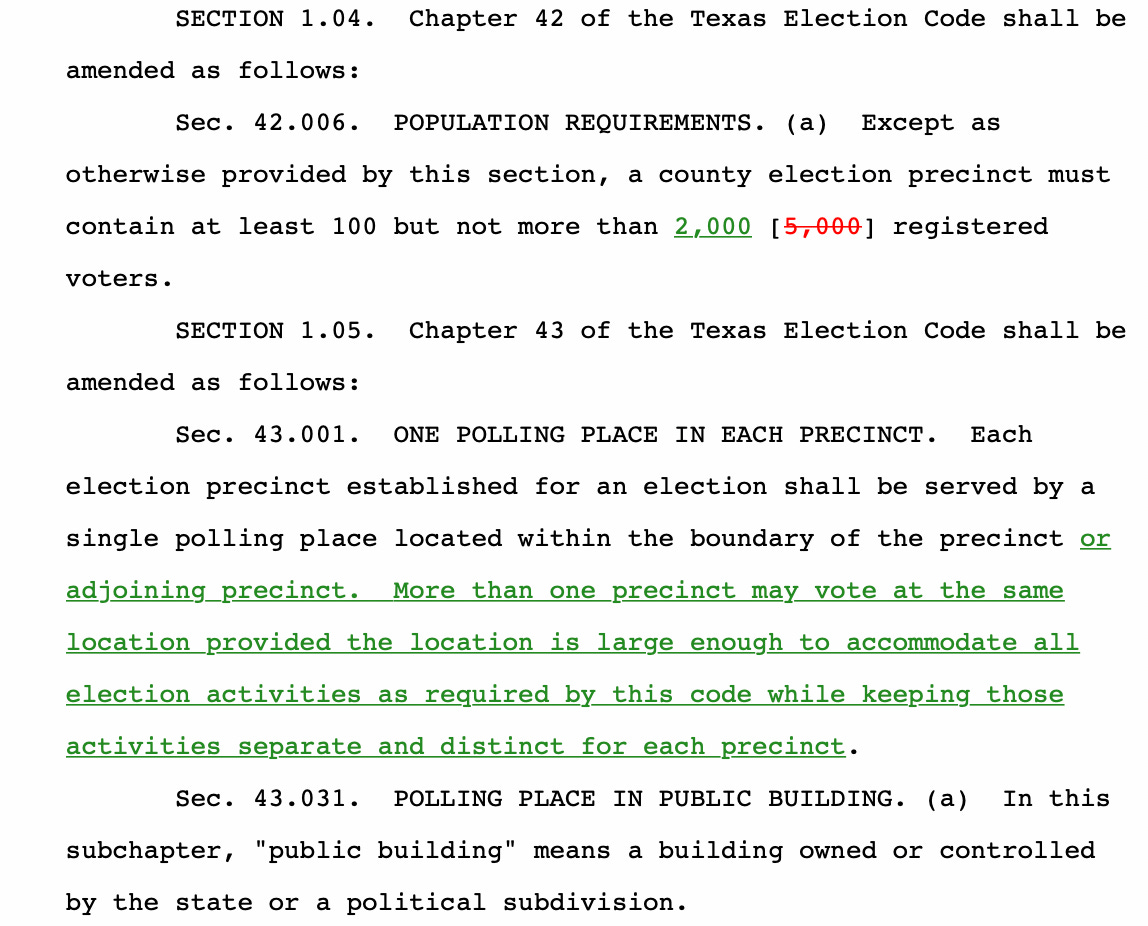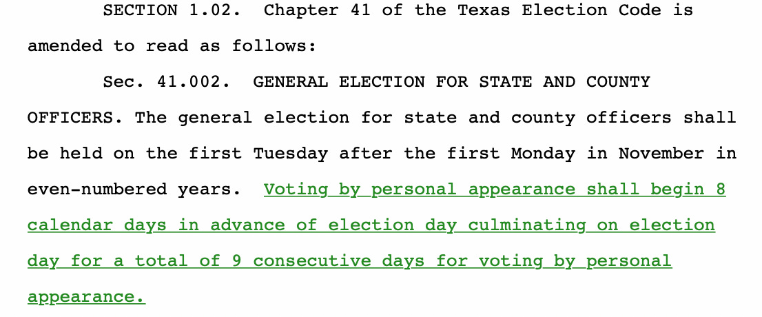 This is a good start, and honestly, a more palatable way to get it across given that we must further reduce precinct sizes to fully eradicate early voting. Per this bill, In-person voting would start the week before Election Day, on Monday, and run straight through the big day.