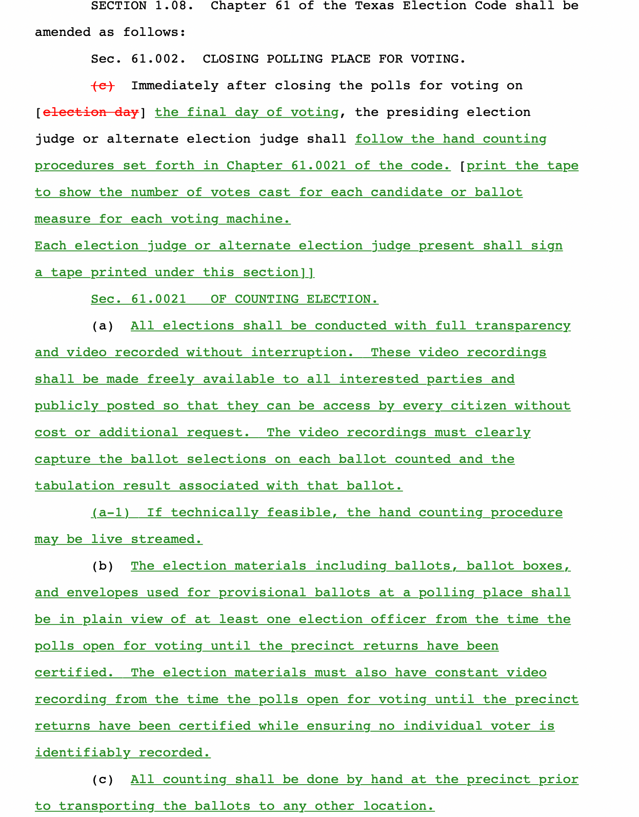 This section of Toth’s bill specifies procedures for vote tallying at these beautiful, smaller precincts that will be hand-counting auditable ballots printed in accordance with Texas law. All election activities within a precinct are to be video-recorded, and if possible, live-streamed for public viewing. Preventing Runbeck-level disasters is a priority here, as mail-in ballots (which should be banned) are to be counted at the precinct in which the voter would have voted in person, not transported, and counted elsewhere, such as a centralized voting center.