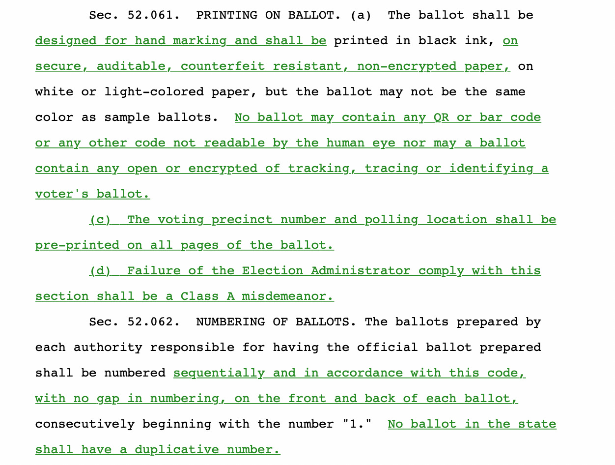 Toth sets the stage for machine-free elections, building on the smaller precinct sizes proposed earlier in the bill with a call for ballots to be designed for hand-marking on simple paper that can be audited without being marred by confusing QR codes or anything “not readable by the human eye.”