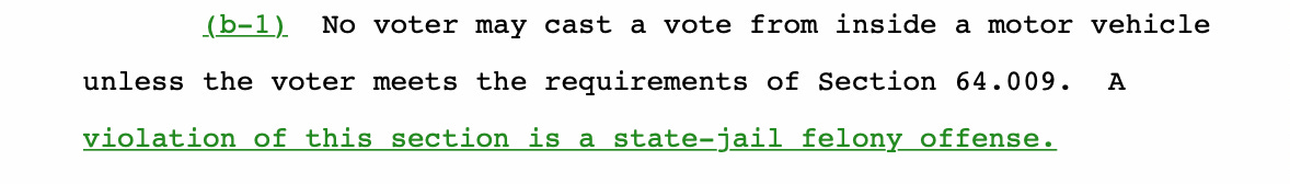 Toth’s bill reduces the maximum number of registered voters in a precinct from 5,000 to 2,000, which marks damn good progress and will have immediate impact in Harris, Travis, Bexar, Williamson, and DFW Metroplex counties. This is the first step to de-normalizing mail-in and early voting and getting in position to have a one-day, one-vote election system in the future. This portion of the bill also sets forth many commonsense tweaks and specifies allowable voting locations, as made visible in the above image, and also makes drive through voting a felony offense in most cases (see below):