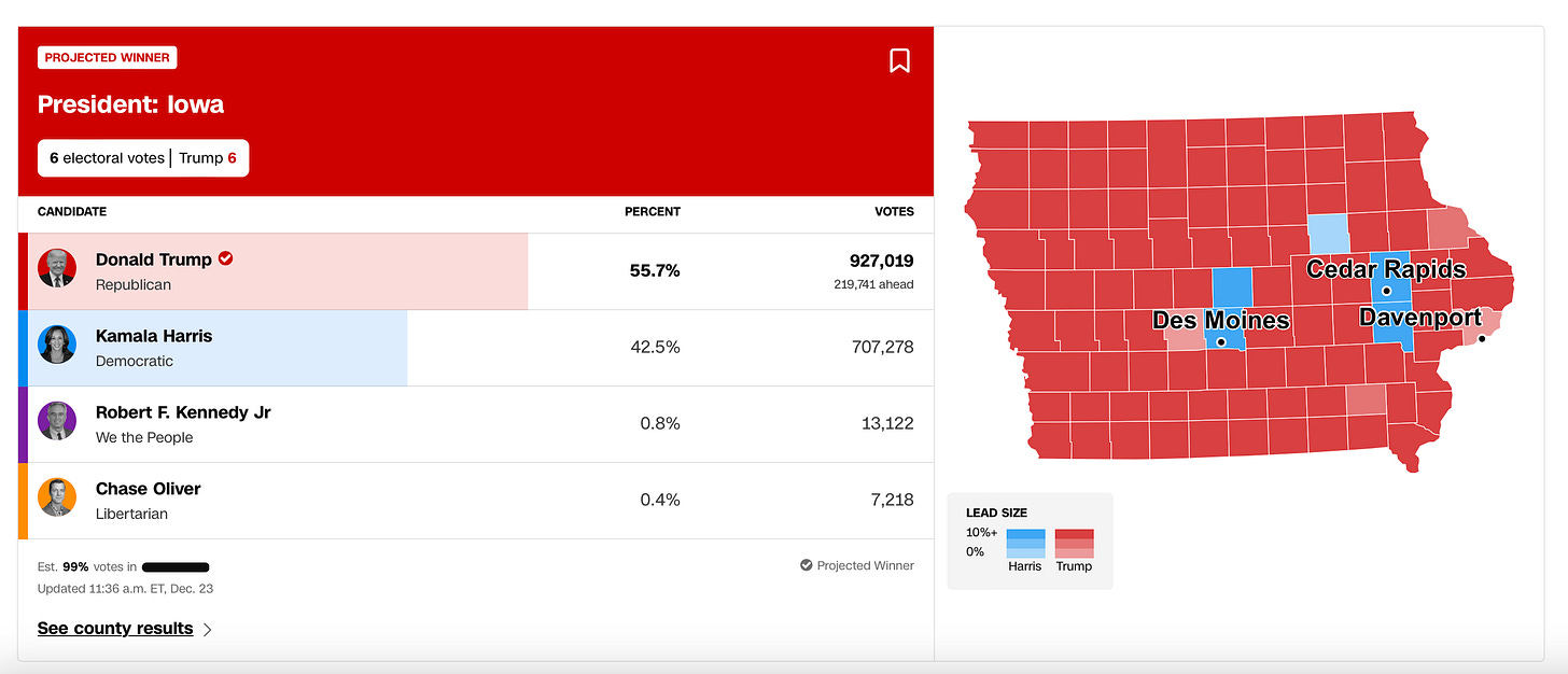 In early November, Ann Selzer, Iowa’s once-respected pollster who called the state nearly right on the money in 2016 and 2020, indicated Kamala Harris was on pace to win the state by 3 points. Just about everyone knew this smelled like rotten seafood, given that both campaigns were all over Wisconsin, which sits well to the left of the Hawkeye State. You can read my full thoughts on the Selzer poll as it was released here.