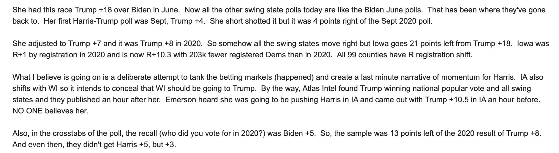 You introduced me on your show to Seth Keshel, who focuses on registration patterns, and I was sufficiently perturbed by the Iowa results - and I went to him among seven or eight other people. And it was fascinating because he thinks it is extraordinarily improbable just given patterns that have been building.