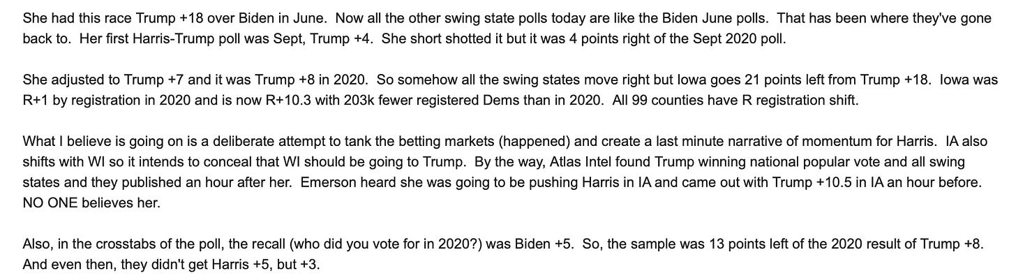 Of course you did have an alternative poll that came out at the same time that has Trump winning, I think, by 10…I checked in with a former Speaker of the House and she said they had no indications anywhere in any of their counties of the kind of erosion…I think Keshel’s work, if you believe it, in terms of the registration patterns, would imply that we are much closer to a Reagan-Carter result than we are to 2016 or 2020…if you look at the early voting patterns in virtually every one of the swing states - they’re staggering.