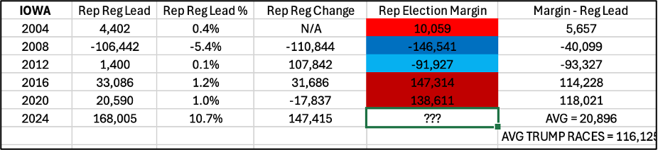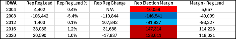 Let me teach you how to read this chart. In 2004, the Republican Party of Iowa had 4,402 more registrations than the Democrats had, or a lead of 0.4% (expressed as R+0.4% in political speak). That year, George W. Bush won the election there by 10,059 votes over John Kerry. 10,059 in margin is 5,657 more than the Republican registration lead (10,059 minus 4,402).