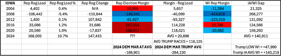 Iowa and Wisconsin have been 124,566 (2016) and 159,293 (2020) ballots apart in Trump’s two races, for an average of 141,930.
