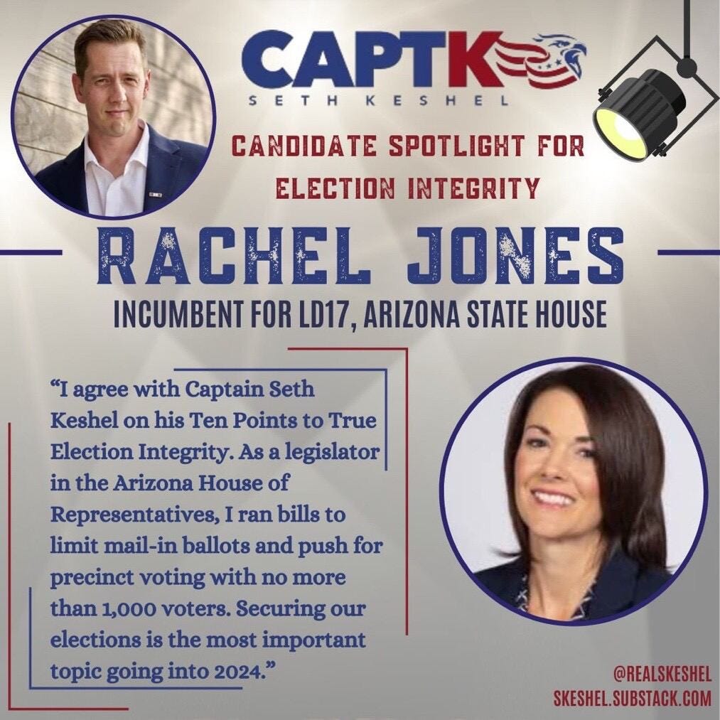 Captain Seth Keshel announces the second election integrity Candidate Spotlight of the 2024 election cycle, and it is for Rachel Jones (Republican), incumbent vying for reelection to one of two Arizona House of Representatives seats in Legislative District 17.