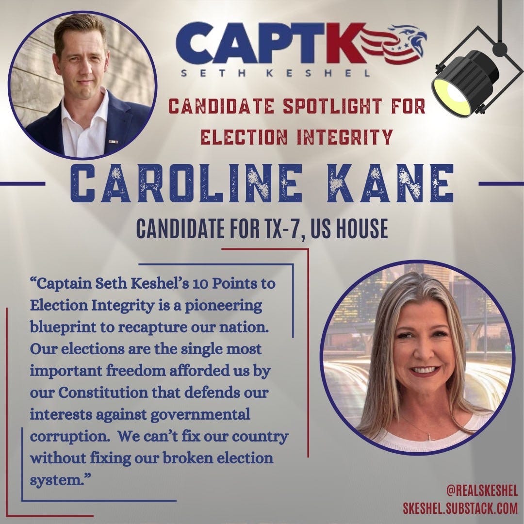 Captain Seth Keshel announces the third election integrity Candidate Spotlight of the 2024 election cycle, and it is for Caroline Kane (Republican), running for the U.S. House seat representing Texas’s 7th Congressional District, located within metro Houston.