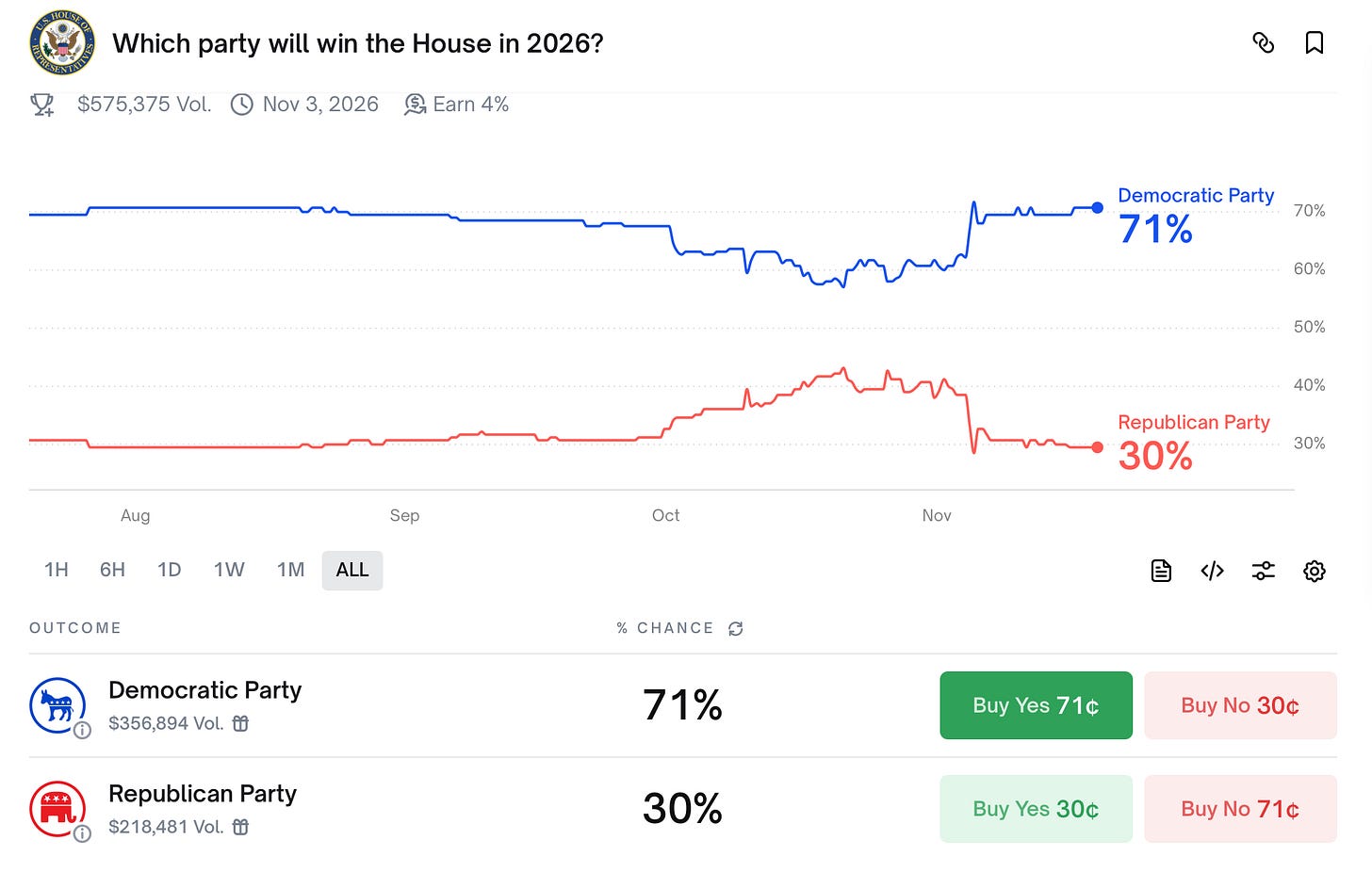 If you feel bold, you can make a lot of money putting a pro-GOP bet out there on Polymarket, which currently gives them better odds than history does for holding the House.