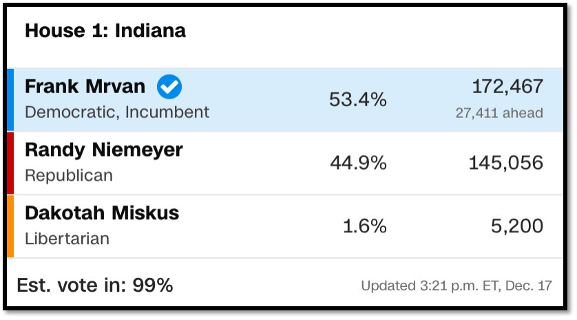 IN-1 is a LEANER favoring Democrats (hold). As currently drawn, and with a Republican President’s midterm looming, I would expect it to remain out of reach. It would take a red wave election, which is most likely in a Democrat President’s midterm, to flip it under normal circumstances, though the margin is close enough it can’t be ruled out as a SAFE seat. Indiana’s legislature could draw this into a Republican flip if they had the willpower to do so.