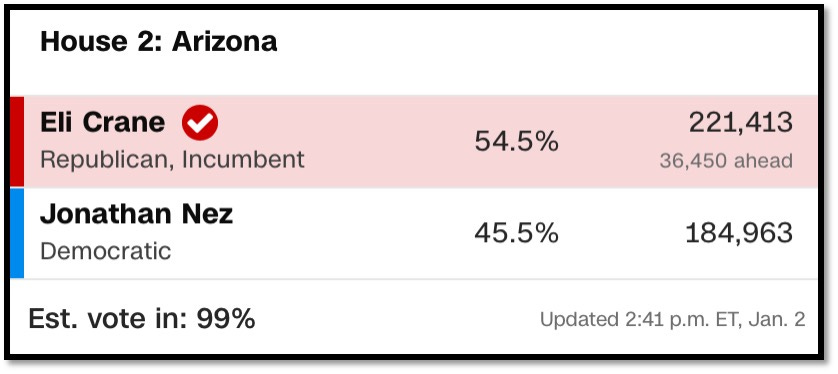 AZ-2 is a LEANER favoring Republicans (hold). With partisan loyalties strong in this district, it would take a serious blue wave to flip, which isn’t likely (if at all) to be strong enough to take AZ-2 even if Democrats have a strong performance next fall. Still, the 2024 margin, concurrent with a presidential, requires a campaign to stave off complacency.