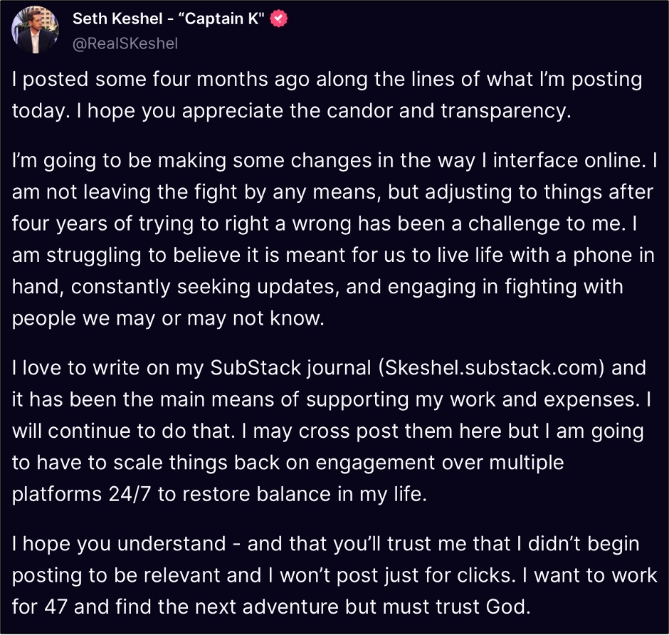 I plan to hand off control of my Telegram channel to trusted colleagues who will continue to post mission-critical content, or anything pertinent coming directly from me. I will drastically reduce posting on Truth Social and X and consider them to be the two most addictive and problem-filled platforms I am part of. I have found that I’ve been unable to resist engaging in the fray, and since Trump’s victory, restlessness has grown to never-before-seen levels and has produced more chaos than I would have ever imagined. I have had all notifications silenced for quite some time, which has clamped down on my urges to respond to all of them. Sometimes this means I don’t see important posts, too.