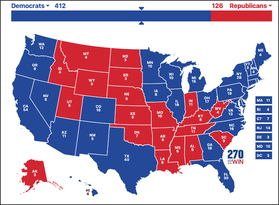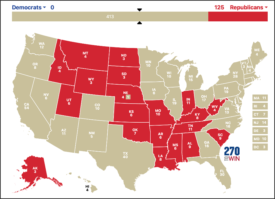 Say goodbye to 20 states, 125 and counting electoral votes, because Democrats are insane and pissed off the white Christian American so badly they will vote for a skunk hide before a Democrat for president – these represent 46.3% of the electoral votes needed to win the White House before campaigning even begins, and with another census properly conducted, may approach half of the requisite electoral payload.