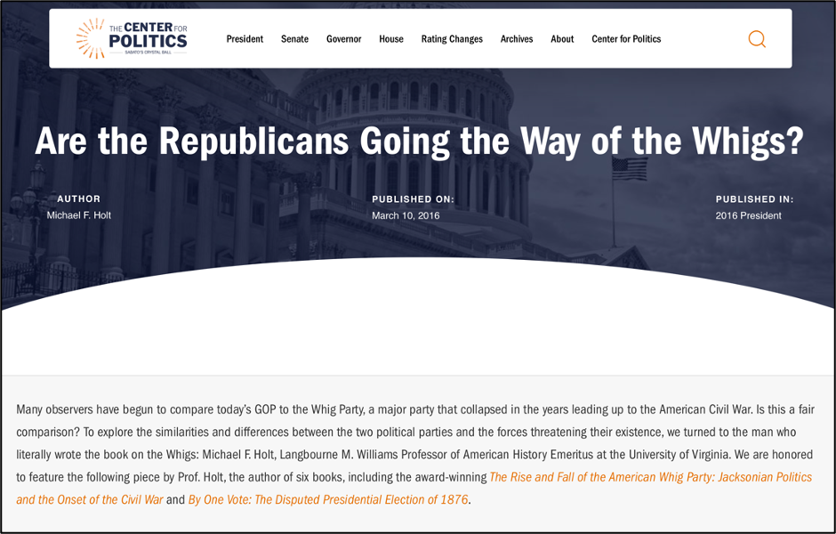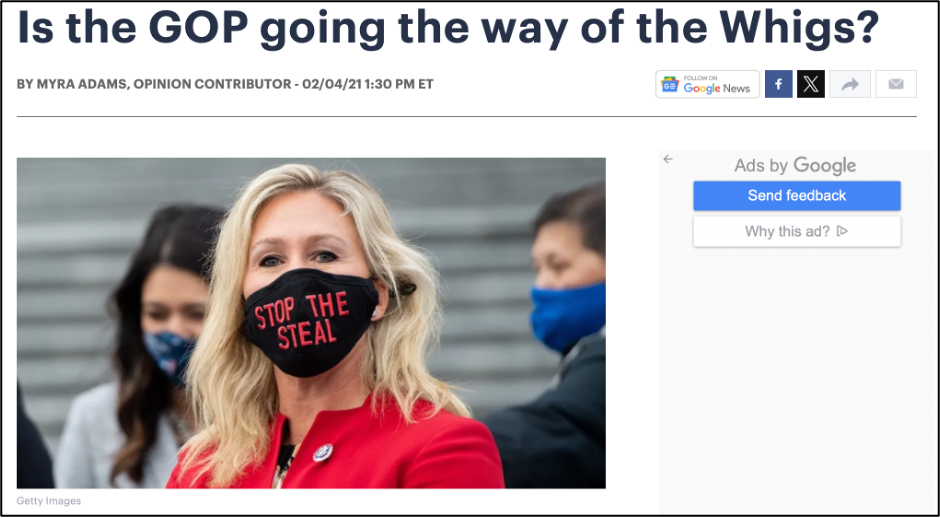 The Way of the Whigs is nothing more than another way to say the following words: extinction, eradication, vanishing, annihilation, exile. The media have been gloating about the GOP going “the way of the Whigs” for quite some time now. The gloating was obvious after the 2020 election fiasco: