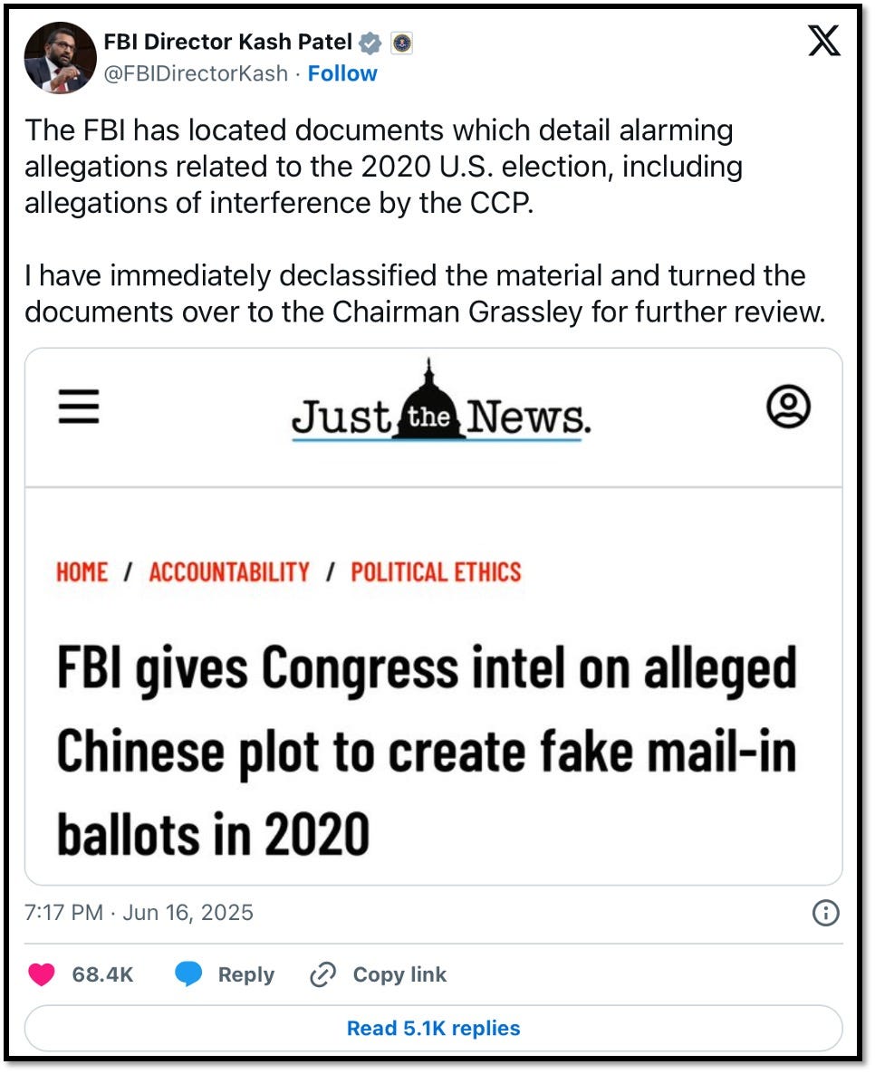Yesterday, with nonstop speculation roaring over the brewing Israel-Iran war in every corner of the Internet, FBI Director Kash Patel announced the declassification of a report highlighting Chinese “influence” of the 2020 U.S. Presidential election (which I refuse to honor as anything greater than a “quasi-election”):