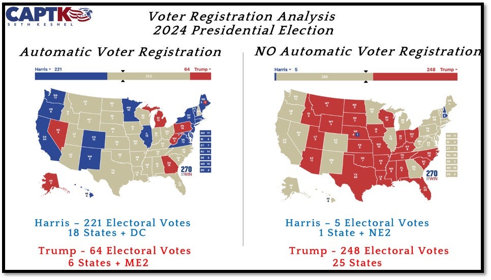 I feel that the software listed above is the major threat, and in some of the exposes made thus far, the altering of electronic votes takes place on a computer screen that the voters can’t see when someone is adjudicating a bad or blank ballot. My take is that rather than electronics, or even the mail voting, the main line of corruption is found in destroying the integrity of voter rolls and flooding them with ineligible or fictitious entries. Remember the slide on Automatic Voter Registration? It couldn’t be more obvious that more registered voters aligns directly with blue state status: