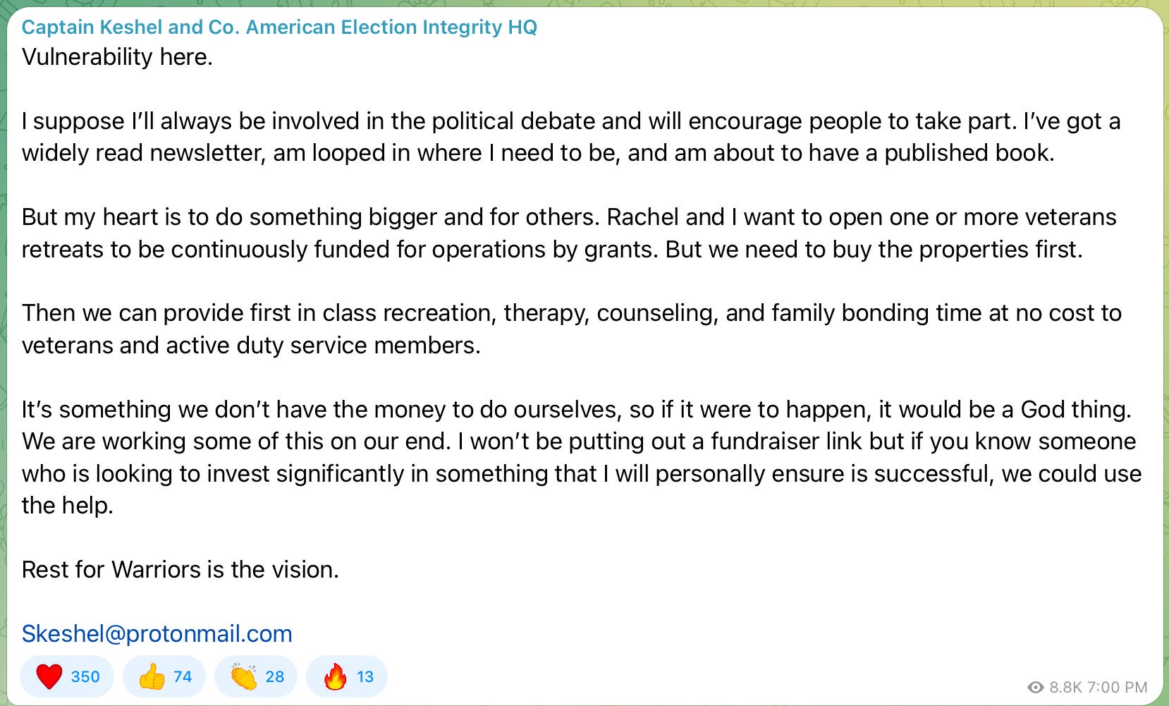 I will consider opening a fund in the future for donations, but for now, if you are connected to any individuals or organizations looking for an opportunity to give back to veterans and invest significant capital in filling an essential need, I would greatly appreciate you reaching out to me at skeshel@protonmail.com and making the connection.