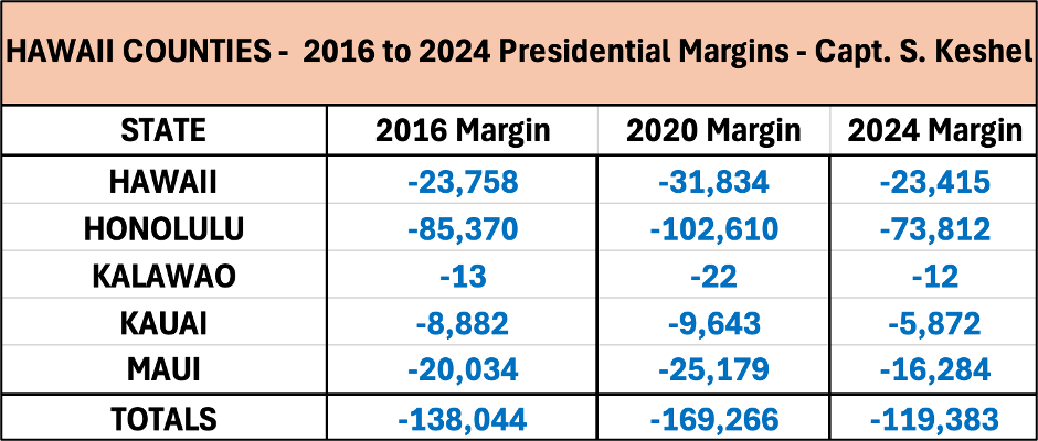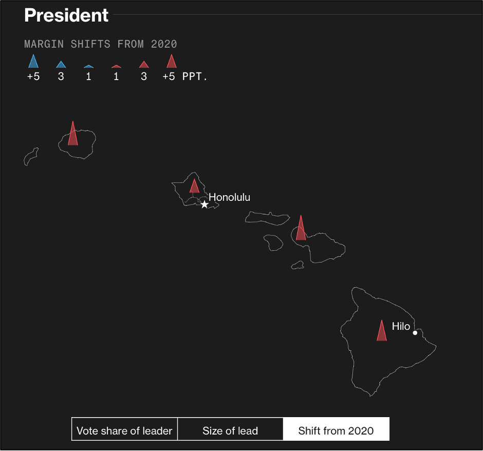 · In Hawaii, where voters are not registered by party, all 5 counties (100.0%) shifted more Republican in percentage margin, meaning Trump lost them by less than he did in 2020. See shifts by county below (Kalawao not captured):