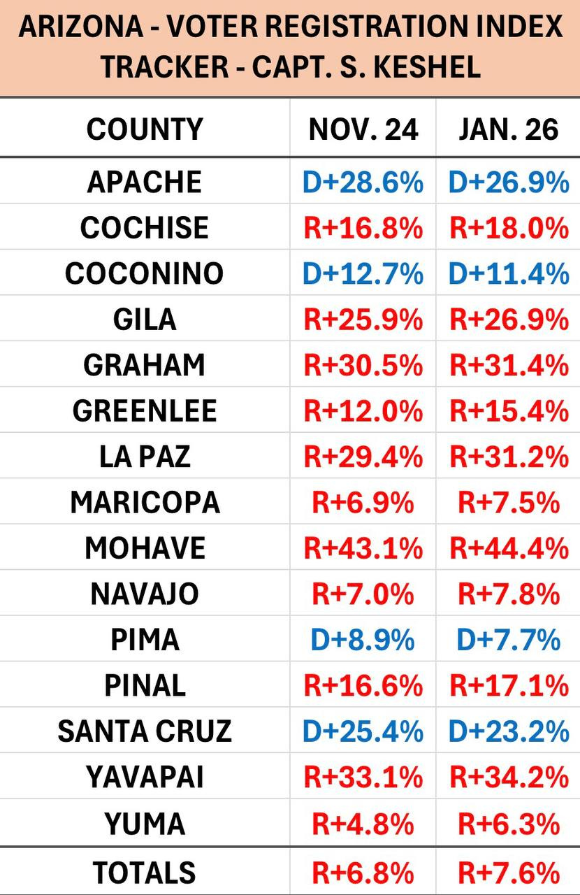 Democrats have made gradual gains in Maricopa County, but I’m not sure how much of that is organic versus how much of that is owed to Recorder Heap’s cuts to voter rolls; voter registration cuts in Pima County, the state’s blue center of gravity, favored the GOP by 3,372 net since December.